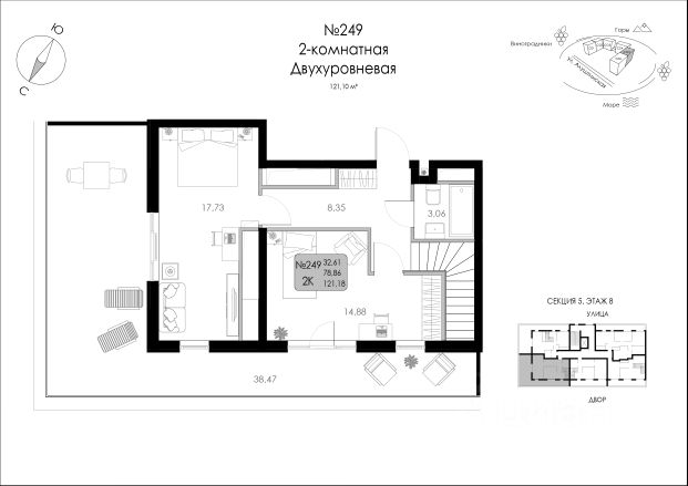 Продается квартира общей площадью 121,18 м2 в комплексе бизнес-класса "Долина Роз" в г. Судак. Квартира N 1/5-249 Видовые характеристики: 2 стороны Этаж: 7 Высота потолков: 3м. Особенности: двухуровневая, угловая квартира. Варианты приобретения: — 100% оплата — Беспроцентная рассрочка — Ипотека от ведущих банков Преимущества комплекса: — Панорамные виды на побережье, горы и виноградники; — в 10 минутах от природных и исторических достопримечательностей; Более 40 видов планировочных решений: — Нет квартир-студий; — Квартиры с собственным патио; — Квартиры с лоджией из кухни-гостиной или из спальни; — Пентхаусы с террасами; — Двухуровневые квартиры с террасами; — Квартиры с арочными окнами; — Квартиры с окном в ванной; — Квартиры с высотой потолка до 3.7м; — ФЗ-214. Инфраструктура: — Открытый бассейн с зонами отдыха и шезлонгами; — Собственная традиционно оборудованная баня; — Многофункциональная спортивная площадка и уличный workout; — Велосипедная дорожка по всему периметру жилого комплекса; — Детские площадки с безопасным покрытием; — Прогулочные аллеи с местами для отдыха; — Торговый центр; — Коммерческие помещения; — Келлеры для хранения вещей — Большая открытая парковка; — Закрытая охраняемая территория. SERVICE Аll inclusive от собственной сервисной компании: трансфер до комплекса, подготовка квартир к вашему приезду, аниматоры на детский праздник, клининг-сервис, экскурсии и трансфер по Крыму, прокат спортивного инвентаря и яхт. Предоставление услуг под любой из ваших запросов! Комплекс реализуется по 214-ФЗ. Для записи на просмотр звоните в отдел продаж!