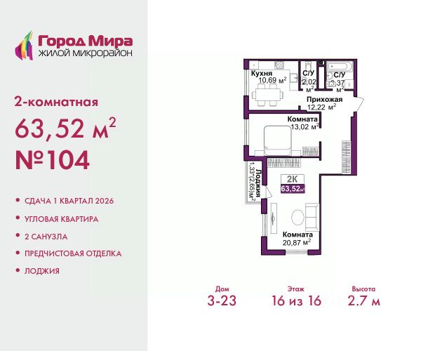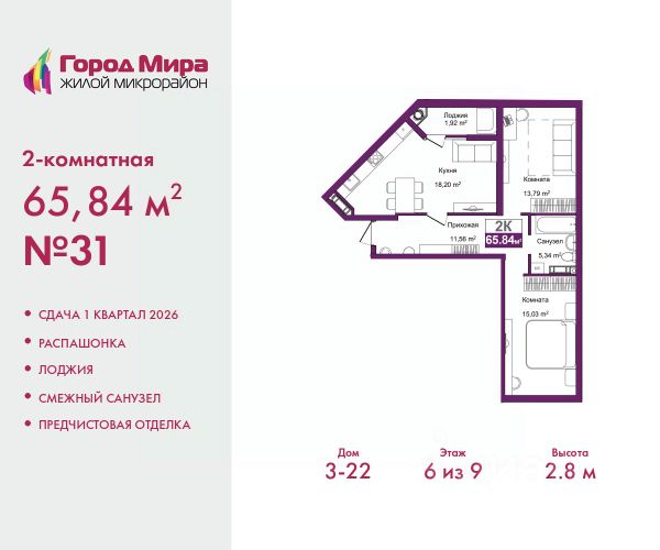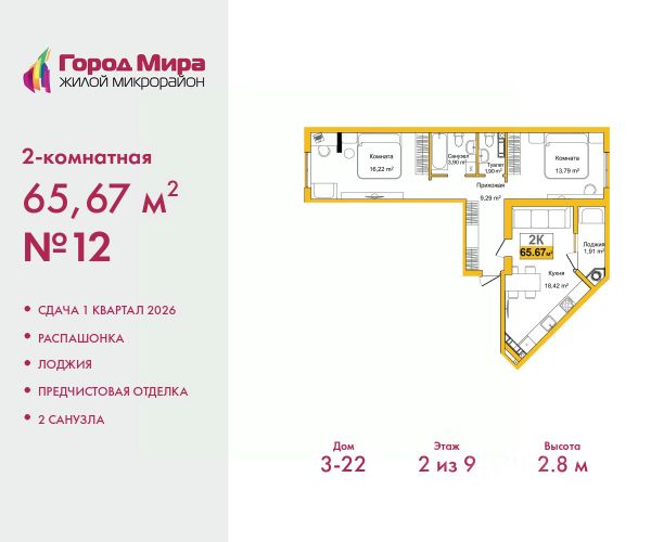 Двухкомнатная квартира с европланировкой и предчистовой отделкой в ЖМ "Город Мира" на 9 этаже. Общая площадь: 42.4 кв.м., жилая: 17.17 кв.м., суммарная площадь гостиной-столовой с кухонной зоной: 17.25 кв.м. Европейская планировка, в просторной кухне-гостиной удобно как готовить, так и отдыхать. Комнаты изолированные, все окна выходят на одну сторону. В квартире один балкон, один совмещенный санузел. Высота потолков 2.7 м. "Город Мира" это масштабный жилой комплекс, созданный для тех, кто ценит комфорт, безопасность и гармонию с природой. Здесь продумана каждая деталь от удобной инфраструктуры до эргономичных планировок квартир. "Город Мира" победил в номинации "Лучший экологический проект года в сфере строительства" по версии премии Сrimеа Urbаn Аwаrds. Способы приобретения недвижимости в "Городе Мира": 1. Ипотека: семейная от 5,5%, военная, IT-ипотека, базовая ипотечная программа и комбо-ипотека. Одобрение заявки проходит сразу в отделе продаж. 2. Материнский капитал на первый взнос. 3. Рассрочка от застройщика - до июня 2028 года! Первоначальный взнос от 30%. 4. Военная ипотека. Участники НИС могут приобрести квартиры по спец.цене. Ключевые преимущества комплекса: удачное расположение зеленый район с благоприятным микроклиматом продуманное зонирование жилые кварталы, зоны отдыха и коммерческие объекты комфорт-класс высокое качество строительства и современные инженерные решения Почему дом повышенной комфортности 2 в "Городе Мира" это лучшее решение? Образование и досуг: 2 детских сада (по 260 мест каждый) планируется строительство общеобразовательной школы детские и спортивные площадки в каждом дворе беседки для отдыха, зоны для выгула собак Ритейл и сервис: магазины, аптеки, медицинские центры фитнес-клубы, салоны красоты детские развивающие центры Парковки: гостевые парковки наземные и подземные паркинги Квартиры с продуманным комфортом: просторные планировки с кладовыми и колясочными лоджии с остеклением лапомойки для питомцев на первых этажах домов индивидуальное отопление выполнена стяжка пола и штукатурка стен консьерж-сервис для дополнительного удобства Благоустройство территории: ландшафтный дизайн с зонами отдыха современные детские площадки стильные холлы с дизайнерской отделкой система видеонаблюдения для безопасности "Город Мира" это место, где созданы все условия для комфортной жизни. Выбирайте качество и продуманность в каждой детали! Квартира находится во доме повышенной комфортности 2, 4-я очередь. Дом монолитно-каркасный, одноподъездный, высотой 16 этажей. В подъезде 1 пассажирский и 1 грузовой лифт. Окончание строительства - 2 квартал 2028 года. Оформление сделки по договору долевого участия. Квартира находится в корпусе 2. Дом монолитный, одноподъездный, высотой 16 этажей. На этаже 7 квартир. В подъезде 1 пассажирский и 1 грузовой лифт. Окончание строительства - 2 квартал 2028 года. Оформление сделки по договору долевого участия. #zMe29V Купить 2-комнатную квартиру в новостройке с отделкой в Симферополе.