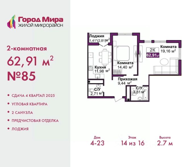 Просторная двухкомнатная квартира с предчистовой отделкой в ЖМ "Город Мира" на 14 этаже. Общая площадь: 62.91 кв.м., жилая: 33.56 кв.м., площадь просторной кухни-столовой: 11.98 кв.м. Угловая квартира, идеально подойдет любителям тишины и панорамных видов. В квартире одна лоджия, один совмещенный и один раздельный санузел. Высота потолков 2.7 м. "Город Мира" это масштабный жилой комплекс, созданный для тех, кто ценит комфорт, безопасность и гармонию с природой. Здесь продумана каждая деталь от удобной инфраструктуры до эргономичных планировок квартир. Главные преимущества: Удачное расположение зеленый район с благоприятным микроклиматом Продуманное зонирование жилые кварталы, зоны отдыха и коммерческие объекты Комфорт-класс высокое качество строительства и современные инженерные решения Инфраструктура Города Мира: Образование и досуг: 2 детских сада (по 260 мест каждый) Планируется строительство общеобразовательной школы Детские и спортивные площадки в каждом дворе Беседки для отдыха, зоны для выгула собак Торговля и сервис: Магазины, аптеки, медицинские центры Фитнес-клубы, салоны красоты Детские развивающие центры Парковки: Гостевые парковки Наземные и подземные паркинги Благоустройство территории: Ландшафтный дизайн с зонами отдыха Современные детские площадки Стильные холлы с дизайнерской отделкой Система видеонаблюдения для безопасности. Почему именно 23-й дом? Комфорт и планировки: • Просторные квартиры с двумя санузлами и гардеробными • Увеличенная площадь остекления — максимум света и воздуха • Индивидуальное отопление — комфорт в любое время года Эстетика и стиль: • Дизайнерские входные группы — стиль начинается с порога • Архитектурная подсветка фасада — дом, которым хочется гордиться • Панорамные виды на город и сосновый бор рядом Инфраструктура и удобство: • Консьерж-сервис — дополнительный уровень сервиса и безопасности • Колясочные • Выполнена стяжка пола и штукатурка стен • Центральная локация внутри микрорайона — тишина и доступность Жизнь внутри дома: • Двухэтажный стилобат с коммерцией: магазины, кафе, офисы, студии и даже школа танцев • Современный двор: детский игровой комплекс, зоны отдыха для взрослых, зарядка для электромобилей, зона wi-fi на улице Возможно приобретение в ипотеку по выгодным условиям: • ставка — от 6% годовых • первоначальный взнос — от 20% • срок — до 30 лет • можно использовать материнский капитал даже на первый взнос. Также доступны военная и IT-ипотека Рассрочка от застройщика: • первый взнос от 30%, • равномерные платежи до окончания строительства. Квартира находится в корпусе 3_23. Дом монолитный, одноподъездный, высотой 16 этажей. В подъезде 1 пассажирский и 1 грузовой лифт. Окончание строительства - 4 квартал 2025 года. Оформление сделки по договору долевого участия. #zSS989