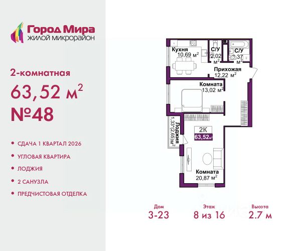 Продаётся 2-комнатная квартира в строящемся доме (Дом 2), срок сдачи: II-кв. 2026, общей площадью 67.3 кв.м., на 2 этаже. ЖК Поэма - это территория вдохновения и творческих идей Здесь Вы ощутите внутреннюю свободу, простор для новых планов и реализации возможностей, став автором своей собственной поэмы. Объект комфорт-класса великолепно расположен в центре Симферополя на улице Трубаченко. Два монолитно-каркасных дома возводятся в сдержанном, изысканном стиле, сочетая в себе эстетику и надёжность. Большие площади остекления подчёркивают современную архитектуру здания. Собственная крышная котельная и актуальные технические решения обеспечат будущим собственникам исключительный комфорт. Территория дома благоустроена по самым актуальным стандартам: закрытый двор видеодомофоны с функцией распознавания лиц помещение для размещения консьерж-сервиса, который позаботится о комфорте, безопасности проживающих, уюте и чистоте ландшафтное озеленение с редкими видами растений и системой автополива детская площадка с инновационным оборудованием современный воркаут и зона для занятий йогой lounge - зона с гамаками холлы с ремонтом по индивидуальному дизайнерскому проекту места для стоянки велосипедов и колясок (во дворе) система видеонаблюдения выделенная зона для парковки транспортных средств площадью более 2200 кв. м. с возможностью выезда на ул. Трубаченко и ул. Крымских Партизан. В жилом комплексе Поэма Вы сможете наслаждаться потрясающими видами на город, живописными рассветами и незабываемыми закатами прямо из окна своей квартиры. Локация объекта привлекает также и развитой инфраструктурой. Это район с транспортной доступностью по всем направлениям. Поблизости расположены супермаркеты, торговые центры, банки, детские сады и школы, спортивный клуб, аптеки, химчистка, кафе и рестораны. В нескольких минутах ходьбы парк им. Шевченко - один из старейших в Симферополе. Это любимое место отдыха для многих поколений, где приятно проводить время в гармонии с природой. Жилой комплекс Поэма - свободный ритм, достижимая высота. Купить 2-комнатную квартиру с отделкой в Симферополе.