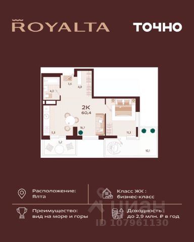More.Yalta — это 8 корпусов высотой 8 этажей. Здесь представлены студии и 13-комнатные апартаменты площадью от 30 до 120 м². Во всех спроектированы балконы, есть варианты с гардеробными, нишами под встроенные шкафы, 2 санузлами. Апартаменты в More.Yalta сдаются с чистовой отделкой, которая включена в цену. Продается 2-комнатная квартира от застройщика в Ялте.