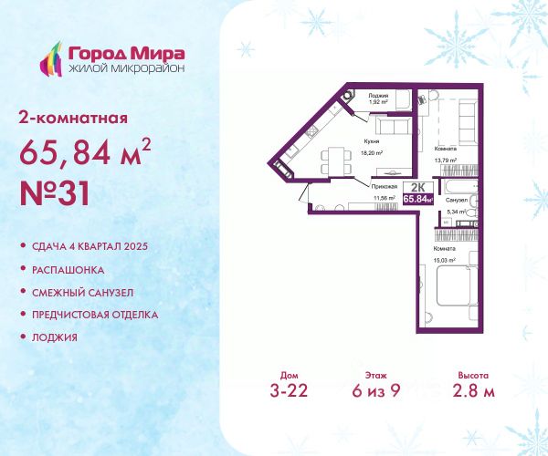 2-комн. квартира с предчистовой отделкой в ЖМ "Город Мира" на 6 этаже. Общая площадь: 65.84 кв.м., жилая: 28.82 кв.м., площадь просторной кухни-столовой: 18.2 кв.м. Квартира - распашонка, без проходных комнат, окна выходят на paзные стороны дома. В квартире одна лоджия, один совмещенный санузел. Высота потолков 2.8 м. Жилой комплекс "Город Мира" комфорт и гармония в современном формате. "Город Мира" это масштабный жилой комплекс, созданный для тех, кто ценит комфорт, безопасность и гармонию с природой. Здесь продумана каждая деталь от удобной инфраструктуры до эргономичных планировок квартир. В 2024 году микрорайон "Город Мира" победил в номинации "Лучший экологический проект года в сфере строительства" по версии премии Crimea Urban Awards. Ключевые преимущества комплекса: - удачное расположение зеленый район с благоприятным микроклиматом - продуманное зонирование жилые кварталы, зоны отдыха и коммерческие объекты - комфорт-класс высокое качество строительства и современные инженерные решения Инфраструктура "Города Мира": Образование и досуг: - 2 детских сада (по 260 мест каждый) - планируется строительство общеобразовательной школы - детские и спортивные площадки в каждом дворе - беседки для отдыха, зоны для выгула собак Ритейл и сервис: - магазины, аптеки, медицинские центры - фитнес-клубы, салоны красоты - детские развивающие центры Парковки: - гостевые парковки - наземные и подземные паркинги Квартиры с продуманным комфортом: - просторные планировки с кладовыми и колясочными - автономное отопление (по 23 дому: индивидуальное отопление) - выполнена стяжка пола (по 3, 4, 20, 21, 22 домам: выполненная стяжка пола и штукатурка стен) - Консьерж-сервис для дополнительного удобства Благоустройство территории: - ландшафтный дизайн с зонами отдыха - современные детские площадки - стильные холлы с дизайнерской отделкой - система видеонаблюдения для безопасности "Город Мира" это место, где созданы все условия для комфортной жизни. Выбирайте качество и продуманность в каждой детали! Квартира находится в корпусе 3_22. Дом монолитный, одноподъездный, высотой 9 этажей. В подъезде 1 грузовой лифт. Окончание строительства - 4 квартал 2025 года. Оформление сделки по договору долевого участия. #255g77
