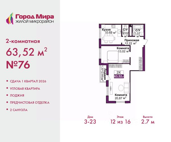 Продаётся 2-комнатная квартира в строящемся доме (Дом 2), срок сдачи: II-кв. 2026, общей площадью 67.3 кв.м., на 2 этаже. ЖК Поэма - это территория вдохновения и творческих идей Здесь Вы ощутите внутреннюю свободу, простор для новых планов и реализации возможностей, став автором своей собственной поэмы. Объект комфорт-класса великолепно расположен в центре Симферополя на улице Трубаченко. Два монолитно-каркасных дома возводятся в сдержанном, изысканном стиле, сочетая в себе эстетику и надёжность. Большие площади остекления подчёркивают современную архитектуру здания. Собственная крышная котельная и актуальные технические решения обеспечат будущим собственникам исключительный комфорт. Территория дома благоустроена по самым актуальным стандартам: закрытый двор видеодомофоны с функцией распознавания лиц помещение для размещения консьерж-сервиса, который позаботится о комфорте, безопасности проживающих, уюте и чистоте ландшафтное озеленение с редкими видами растений и системой автополива детская площадка с инновационным оборудованием современный воркаут и зона для занятий йогой lounge - зона с гамаками холлы с ремонтом по индивидуальному дизайнерскому проекту места для стоянки велосипедов и колясок (во дворе) система видеонаблюдения выделенная зона для парковки транспортных средств площадью более 2200 кв. м. с возможностью выезда на ул. Трубаченко и ул. Крымских Партизан. В жилом комплексе Поэма Вы сможете наслаждаться потрясающими видами на город, живописными рассветами и незабываемыми закатами прямо из окна своей квартиры. Локация объекта привлекает также и развитой инфраструктурой. Это район с транспортной доступностью по всем направлениям. Поблизости расположены супермаркеты, торговые центры, банки, детские сады и школы, спортивный клуб, аптеки, химчистка, кафе и рестораны. В нескольких минутах ходьбы парк им. Шевченко - один из старейших в Симферополе. Это любимое место отдыха для многих поколений, где приятно проводить время в гармонии с природой. Жилой комплекс Поэма - свободный ритм, достижимая высота. Продам 2-комнатную квартиру с отделкой в Симферополе.