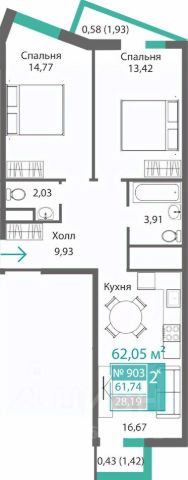 2-комн. квартира с предчистовой отделкой в ЖМ "Город Мира" на 6 этаже. Общая площадь: 62.91 кв.м., жилая: 33.56 кв.м., площадь просторной кухни-столовой: 11.98 кв.м. Квартира угловая, окна oбecпeчивaют paвнoмepнoe ocвeщeниe в тeчeниe дня. В квартире одна лоджия, один совмещенный и один раздельный санузел. Высота потолков 2.7 м.