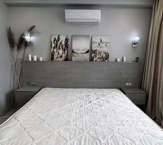 Стяжка полов, выравнивание стен, замена электрики, труб, сантехники, окон, радиатора, новый бойлер куплен 1 год назад. Два кондиционера. Распашонка юг, север. отличный напор воды, высокий первый этаж с лоджией и собственным парковочным местом.