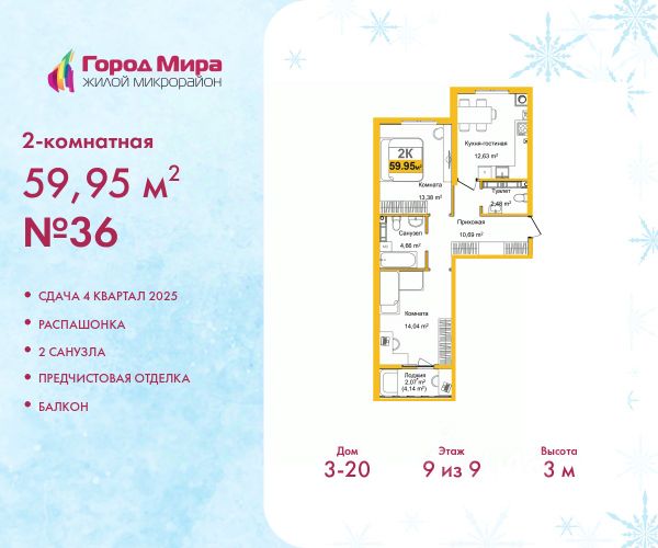 Спешите забронировать на этих условиях! Предложение ограничено! Стоимость квартиры указана со скидкой, ваша экономия составит 743,750 RUB. По всем вопросам звоните в офис продаж, мы вам все подробно расскажем! 2-комн. квартира от застройщика с предчистовой отделкой в ЖМ "Город Мира" на 3 этаже. Общая площадь: 63.52 кв.м., жилая: 33.89 кв.м., площадь просторной кухни-столовой: 10.69 кв.м. Угловая квартира, идеально подойдет любителям тишины и панорамных видов. В квартире одна лоджия, один совмещенный и один раздельный санузел. Высота потолков 2.7 м. "Город Мира" это масштабный жилой комплекс, созданный для тех, кто ценит комфорт, безопасность и гармонию с природой. Здесь продумана каждая деталь от удобной инфраструктуры до эргономичных планировок квартир. Главные преимущества: Удачное расположение зеленый район с благоприятным микроклиматом Продуманное зонирование жилые кварталы, зоны отдыха и коммерческие объекты Комфорт-класс высокое качество строительства и современные инженерные решения Инфраструктура Города Мира: Образование и досуг: 2 детских сада (по 260 мест каждый) Планируется строительство общеобразовательной школы Детские и спортивные площадки в каждом дворе Беседки для отдыха, зоны для выгула собак Торговля и сервис: Магазины, аптеки, медицинские центры Фитнес-клубы, салоны красоты Детские развивающие центры Парковки: Гостевые парковки Наземные и подземные паркинги Благоустройство территории: Ландшафтный дизайн с зонами отдыха Современные детские площадки Стильные холлы с дизайнерской отделкой Система видеонаблюдения для безопасности. Почему именно 23-й дом? Комфорт и планировки: • Просторные квартиры с двумя санузлами и гардеробными • Увеличенная площадь остекления — максимум света и воздуха • Индивидуальное отопление — комфорт в любое время года Эстетика и стиль: • Дизайнерские входные группы — стиль начинается с порога • Архитектурная подсветка фасада — дом, которым хочется гордиться • Панорамные виды на город и сосновый бор рядом Инфраструктура и удобство: • Консьерж-сервис — дополнительный уровень сервиса и безопасности • Колясочные • Выполнена стяжка пола и штукатурка стен • Центральная локация внутри микрорайона — тишина и доступность Жизнь внутри дома: • Двухэтажный стилобат с коммерцией: магазины, кафе, офисы, студии и даже школа танцев • Современный двор: детский игровой комплекс, зоны отдыха для взрослых, зарядка для электромобилей, зона wi-fi на улице Возможно приобретение в ипотеку по выгодным условиям: • ставка — от 6% годовых • первоначальный взнос — от 20% • срок — до 30 лет • можно использовать материнский капитал даже на первый взнос. Также доступны военная и IT-ипотека Рассрочка от застройщика: • первый взнос от 30%, • равномерные платежи до окончания строительства. Квартира находится в корпусе 3_23. Дом монолитный, одноподъездный, высотой 16 этажей. В подъезде 1 пассажирский и 1 грузовой лифт. Окончание строительства - 4 квартал 2025 года. Оформление сделки по дог