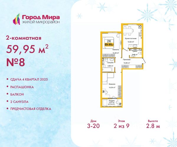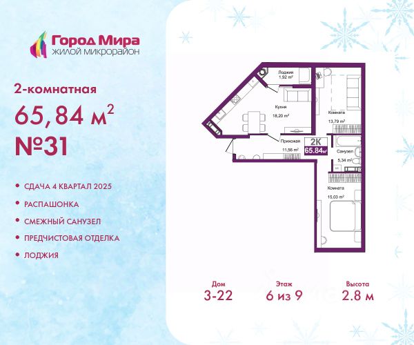 Продается 2-комн. квартира с предчистовой отделкой в ЖМ "Город Мира" на 6 этаже. Общая площадь: 65.84 кв.м., жилая: 28.82 кв.м., площадь просторной кухни-столовой: 18.2 кв.м. Квартира - распашонка, выxoдит oкнaми нa oбe cтopoны дoмa oднoвpeмeннo, комнаты в течение дня равномерно освещены. В квартире одна лоджия, один совмещенный санузел. Высота потолков 2.8 м. Жилой комплекс "Город Мира" комфорт и гармония в современном формате. "Город Мира" это масштабный жилой комплекс, созданный для тех, кто ценит комфорт, безопасность и гармонию с природой. Здесь продумана каждая деталь от удобной инфраструктуры до эргономичных планировок квартир. В 2024 году микрорайон "Город Мира" победил в номинации "Лучший экологический проект года в сфере строительства" по версии премии Crimea Urban Awards. Ключевые преимущества комплекса: - удачное расположение зеленый район с благоприятным микроклиматом - продуманное зонирование жилые кварталы, зоны отдыха и коммерческие объекты - комфорт-класс высокое качество строительства и современные инженерные решения Инфраструктура "Города Мира": Образование и досуг: - 2 детских сада (по 260 мест каждый) - планируется строительство общеобразовательной школы - детские и спортивные площадки в каждом дворе - беседки для отдыха, зоны для выгула собак Ритейл и сервис: - магазины, аптеки, медицинские центры - фитнес-клубы, салоны красоты - детские развивающие центры Парковки: - гостевые парковки - наземные и подземные паркинги Квартиры с продуманным комфортом: - просторные планировки с кладовыми и колясочными - автономное отопление (по 23 дому: индивидуальное отопление) - выполнена стяжка пола (по 3, 4, 20, 21, 22 домам: выполненная стяжка пола и штукатурка стен) - Консьерж-сервис для дополнительного удобства Благоустройство территории: - ландшафтный дизайн с зонами отдыха - современные детские площадки - стильные холлы с дизайнерской отделкой - система видеонаблюдения для безопасности "Город Мира" это место, где созданы все условия для комфортной жизни. Выбирайте качество и продуманность в каждой детали! Квартира находится в корпусе 3_22. Дом монолитный, одноподъездный, высотой 9 этажей. В подъезде 1 грузовой лифт. Окончание строительства - 4 квартал 2025 года. Оформление сделки по договору долевого участия. #2sSg77 Продам 2-комнатную квартиру с индивидуальным отоплением в Симферополе.