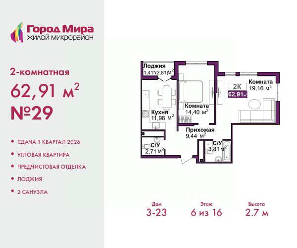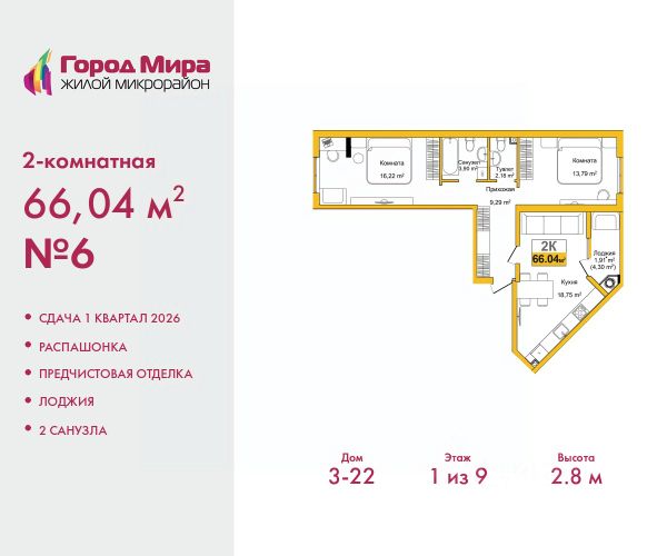 Просторная двухкомнатная квартира с предчистовой отделкой в ЖМ "Город Мира" на 9 этаже. Общая площадь: 62.1 кв.м., жилая: 26.7 кв.м., площадь просторной кухни-столовой: 14.7 кв.м. Квартира угловая, идеально подойдет любителям тишины и панорамных видов. В квартире одна лоджия, один совмещенный санузел. Высота потолков 2.7 м. "Город Мира" это масштабный жилой комплекс, созданный для тех, кто ценит комфорт, безопасность и гармонию с природой. Здесь продумана каждая деталь от удобной инфраструктуры до эргономичных планировок квартир. "Город Мира" победил в номинации "Лучший экологический проект года в сфере строительства" по версии премии Сrimеа Urbаn Аwаrds. Способы приобретения недвижимости в "Городе Мира": 1. Ипотека: семейная от 5,5%, военная, IT-ипотека, базовая ипотечная программа и комбо-ипотека. Одобрение заявки проходит сразу в отделе продаж. 2. Материнский капитал на первый взнос. 3. Рассрочка от застройщика - до июня 2028 года! Первоначальный взнос от 30%. 4. Военная ипотека. Участники НИС могут приобрести квартиры по спец.цене. Ключевые преимущества комплекса: удачное расположение зеленый район с благоприятным микроклиматом продуманное зонирование жилые кварталы, зоны отдыха и коммерческие объекты комфорт-класс высокое качество строительства и современные инженерные решения Почему дом повышенной комфортности 2 в "Городе Мира" это лучшее решение? Образование и досуг: 2 детских сада (по 260 мест каждый) планируется строительство общеобразовательной школы детские и спортивные площадки в каждом дворе беседки для отдыха, зоны для выгула собак Ритейл и сервис: магазины, аптеки, медицинские центры фитнес-клубы, салоны красоты детские развивающие центры Парковки: гостевые парковки наземные и подземные паркинги Квартиры с продуманным комфортом: просторные планировки с кладовыми и колясочными лоджии с остеклением лапомойки для питомцев на первых этажах домов индивидуальное отопление выполнена стяжка пола и штукатурка стен консьерж-сервис для дополнительного удобства Благоустройство территории: ландшафтный дизайн с зонами отдыха современные детские площадки стильные холлы с дизайнерской отделкой система видеонаблюдения для безопасности "Город Мира" это место, где созданы все условия для комфортной жизни. Выбирайте качество и продуманность в каждой детали! Квартира находится во доме повышенной комфортности 2, 4-я очередь. Дом монолитно-каркасный, одноподъездный, высотой 16 этажей. В подъезде 1 пассажирский и 1 грузовой лифт. Окончание строительства - 2 квартал 2028 года. Оформление сделки по договору долевого участия. Квартира находится в корпусе 2. Дом монолитный, одноподъездный, высотой 16 этажей. На этаже 7 квартир. В подъезде 1 пассажирский и 1 грузовой лифт. Окончание строительства - 2 квартал 2028 года. Оформление сделки по договору долевого участия. #ZMDgov Продам 2-комнатную квартиру с лоджией в Симферополе.