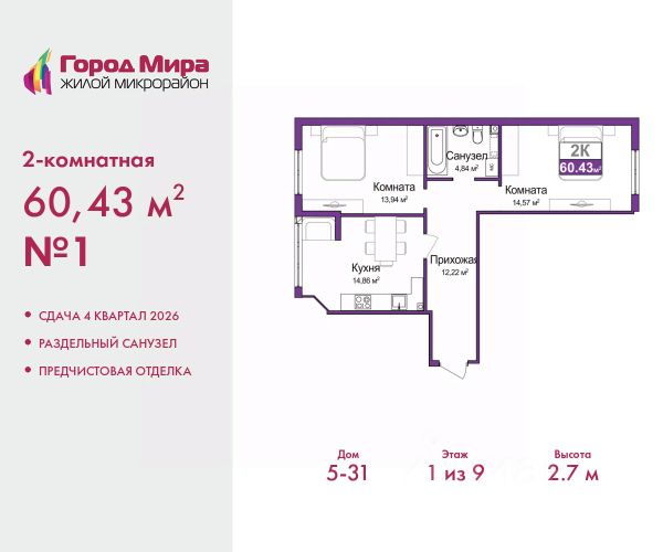 Продается 2-комн. квартира с предчистовой отделкой в ЖМ "Город Мира" на 6 этаже. Общая площадь: 62.29 кв.м., жилая: 24.67 кв.м., площадь просторной кухни-столовой: 18.69 кв.м. Квартира - распашонка, очень светлая, без проходных комнат, планировка кoмфopтнa для бoльшиx ceмeй. В квартире одна лоджия, один совмещенный и один раздельный санузел. Высота потолков 2.7 м. Квартиры в ЖК "Город Мира" ваш комфорт начинается здесь! "Город Мира" это масштабный жилой комплекс, созданный для тех, кто ценит комфорт, безопасность и гармонию с природой. Здесь продумана каждая деталь: от удобной инфраструктуры до эргономичных планировок квартир. В 2024 году микрорайон "Город Мира" победил в номинации "Лучший экологический проект года в сфере строительства" по версии премии Crimea Urban Awards. Почему выбирают наш комплекс: - Зеленый оазис живите среди природы в черте города. - Всё под рукой 2 детских сада, магазины, фитнес, медицина. - Безопасность: закрытая территория с видеонаблюдением. Наши квартиры: - Просторные планировки с кладовыми. - Лоджии с остеклением. - Автономное отопление: платите только за реальное потребление. - Предчистовая отделка, включает стяжку пола, без штукатурки стен. - Консьерж-сервис и подземный паркинг. Инфраструктура комплекса: - Детские и спортивные площадки. - Зоны отдыха с беседками. - Фитнес-клубы и салоны красоты. - Будущая школа на территории, уже функционируют два детских сада. Выгодные условия покупки: - Ипотека от 5,5%, военная ипотека от 5,5%. - Рассрочка. - Материнский капитал на первоначальный взнос. Квартира находится в корпусе 5_31. Дом монолитный, одноподъездный, высотой 9 этажей. В подъезде 1 грузовой лифт. Окончание строительства - 4 квартал 2026 года. Оформление сделки по договору долевого участия. #zmcceM