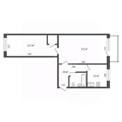 Общая площадь 54,2 кв. м., жилая 30 кв. м., кухня 10 кв. м.