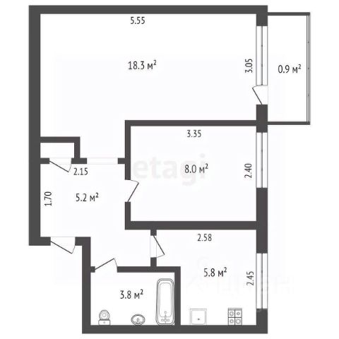 Планировка: коридор 1,9 м2, комнаты смежные 11,8 и 14,5 м2 соответственно, совмещенный санузел 4,8 м2, коридор 3,4 м2, кухня 5,6 м2.