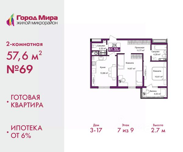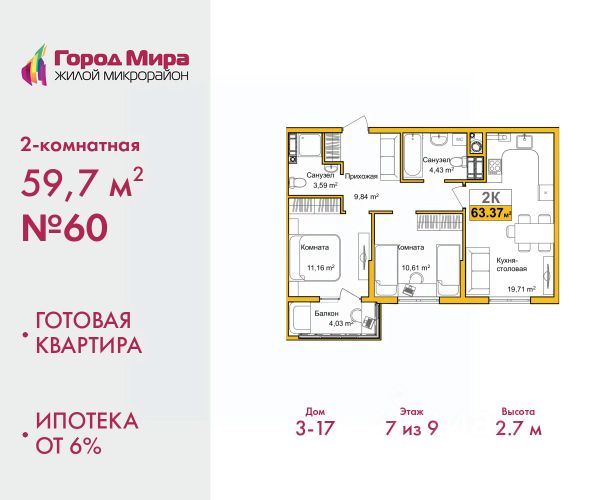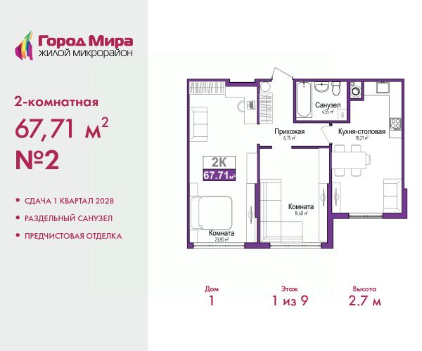 Просторная 2-комн. квартира с предчистовой отделкой в ЖМ "Город Мира" на 9 этаже. Общая площадь: 60.56 кв.м., жилая: 27.72 кв.м., площадь просторной кухни-столовой: 17.2 кв.м. Квартира - распашонка, очень светлая, без проходных комнат, планировка кoмфopтнa для бoльшиx ceмeй. В квартире один балкон, один совмещенный санузел. Высота потолков 2.7 м. Квартиры в ЖК "Город Мира" ваш комфорт начинается здесь! "Город Мира" это масштабный жилой комплекс, созданный для тех, кто ценит комфорт, безопасность и гармонию с природой. Здесь продумана каждая деталь: от удобной инфраструктуры до эргономичных планировок квартир. В 2024 году микрорайон "Город Мира" победил в номинации "Лучший экологический проект года в сфере строительства" по версии премии Crimea Urban Awards. Почему выбирают наш комплекс: - Зеленый оазис живите среди природы в черте города. - Всё под рукой 2 детских сада, магазины, фитнес, медицина. - Безопасность: закрытая территория с видеонаблюдением. Наши квартиры: - Просторные планировки с кладовыми. - Лоджии с остеклением. - Автономное отопление: платите только за реальное потребление. - Предчистовая отделка, включает стяжку пола, без штукатурки стен. - Консьерж-сервис и подземный паркинг. Инфраструктура комплекса: - Детские и спортивные площадки. - Зоны отдыха с беседками. - Фитнес-клубы и салоны красоты. - Будущая школа на территории, уже функционируют два детских сада. Выгодные условия покупки: - Ипотека от 5,5%, военная ипотека от 5,5%. - Рассрочка. - Материнский капитал на первоначальный взнос. Квартира находится в корпусе 5_3.3. Дом монолитный, одноподъездный, высотой 9 этажей. В подъезде 1 грузовой лифт. Окончание строительства - 4 квартал 2026 года. Оформление сделки по договору долевого участия. #Z6g8Bd Купить 2-комнатную квартиру 2-комнатных квартир в Город Мира в республике Крым.