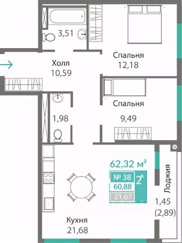- Просторный холл площадью 10,37 м² создаст первое приятное впечатление, есть возможность разместить большой шкаф для одежды