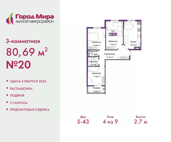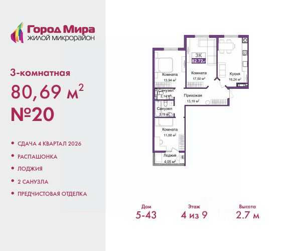 Просторная 3-комн. квартира с предчистовой отделкой в ЖМ "Город Мира" на 4 этаже. Общая площадь: 84.67 кв.м., жилая: 46.28 кв.м., площадь просторной кухни-столовой: 11.65 кв.м. Квартира - распашонка, без проходных комнат, окна выходят на paзные стороны дома. В квартире один балкон, один совмещенный и один раздельный санузел. Высота потолков 2.7 м. Квартиры в ЖК "Город Мира" ваш комфорт начинается здесь! "Город Мира" это масштабный жилой комплекс, созданный для тех, кто ценит комфорт, безопасность и гармонию с природой. Здесь продумана каждая деталь: от удобной инфраструктуры до эргономичных планировок квартир. В 2024 году микрорайон "Город Мира" победил в номинации "Лучший экологический проект года в сфере строительства" по версии премии Crimea Urban Awards. Почему выбирают наш комплекс: - Зеленый оазис живите среди природы в черте города. - Всё под рукой 2 детских сада, магазины, фитнес, медицина. - Безопасность: закрытая территория с видеонаблюдением. Наши квартиры: - Просторные планировки с кладовыми. - Автономное отопление: платите только за реальное потребление. - Готовая предчистовая отделка: стяжка пола, штукатурка стен (кроме 3, 4 домов, где нет штукатурки стен). - Консьерж-сервис и подземный паркинг. Инфраструктура комплекса: - Детские и спортивные площадки. - Зоны отдыха с беседками. - Фитнес-клубы и салоны красоты. - Будущая школа на территории, уже функционируют два детских сада. Выгодные условия покупки: - Ипотека от 5,5%, военная ипотека от 5,5%. - Рассрочка. - Материнский капитал на первоначальный взнос. Квартира находится в корпусе 5_42. Дом монолитный, одноподъездный, высотой 9 этажей. В подъезде 1 грузовой лифт. Окончание строительства - 4 квартал 2026 года. Оформление сделки по договору долевого участия. #2ss9Ai
