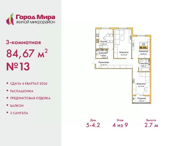 Удачная планировка, застеклённый балкон, раздельный санузел. 4-й этаж, окна выходят на две стороны.