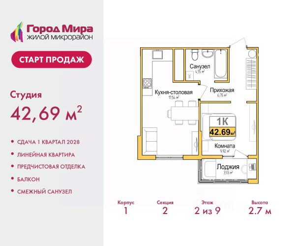 Квартира находится во доме повышенной комфортности 2, 4-я очередь. Дом монолитно-каркасный, одноподъездный, высотой 16 этажей. В подъезде 1 пассажирский и 1 грузовой лифт. Окончание строительства - 2 квартал 2028 года. Оформление сделки по договору долевого участия.