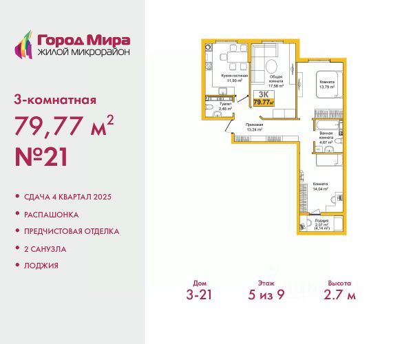 Готовые квартиры. Ипотека от 6%. Информация по телефону, наши менеджеры вам все расскажут! Трехкомнатная квартира с предчистовой отделкой в ЖМ "Город Мира" на 5 этаже. Общая площадь: 78.7 кв.м., жилая: 29.89 кв.м., площадь просторной кухни-столовой: 13.7 кв.м. Квартира - распашонка, без проходных комнат, окна выходят на paзные стороны дома. В квартире один балкон, один совмещенный и один раздельный санузел. Высота потолков 2.7 м. Жилой комплекс "Город Мира" комфорт и гармония в современном формате. "Город Мира" это масштабный жилой комплекс, созданный для тех, кто ценит комфорт, безопасность и гармонию с природой. Здесь продумана каждая деталь от удобной инфраструктуры до эргономичных планировок квартир. В 2024 году микрорайон "Город Мира" победил в номинации "Лучший экологический проект года в сфере строительства" по версии премии Crimea Urban Awards. Ключевые преимущества комплекса: - удачное расположение зеленый район с благоприятным микроклиматом - продуманное зонирование жилые кварталы, зоны отдыха и коммерческие объекты - комфорт-класс высокое качество строительства и современные инженерные решения Инфраструктура "Города Мира": Образование и досуг: - 2 детских сада (по 260 мест каждый) - планируется строительство общеобразовательной школы - детские и спортивные площадки в каждом дворе - беседки для отдыха, зоны для выгула собак Ритейл и сервис: - магазины, аптеки, медицинские центры - фитнес-клубы, салоны красоты - детские развивающие центры Парковки: - гостевые парковки - наземные и подземные паркинги Квартиры с продуманным комфортом: - просторные планировки с кладовыми и колясочными - автономное отопление (по 23 дому: индивидуальное отопление) - выполнена стяжка пола (по 3, 4, 20, 21, 22 домам: выполненная стяжка пола и штукатурка стен) - Консьерж-сервис для дополнительного удобства Благоустройство территории: - ландшафтный дизайн с зонами отдыха - современные детские площадки - стильные холлы с дизайнерской отделкой - система видеонаблюдения для безопасности "Город Мира" это место, где созданы все условия для комфортной жизни. Выбирайте качество и продуманность в каждой детали! Квартира находится в корпусе 3_18. Дом монолитный, одноподъездный, высотой 9 этажей. В подъезде 1 грузовой лифт. На сегодняшний день строительство завершено, дом сдан в 4 квартале 2024 года. Оформление сделки по договору купли-продажи. #2M2UzB