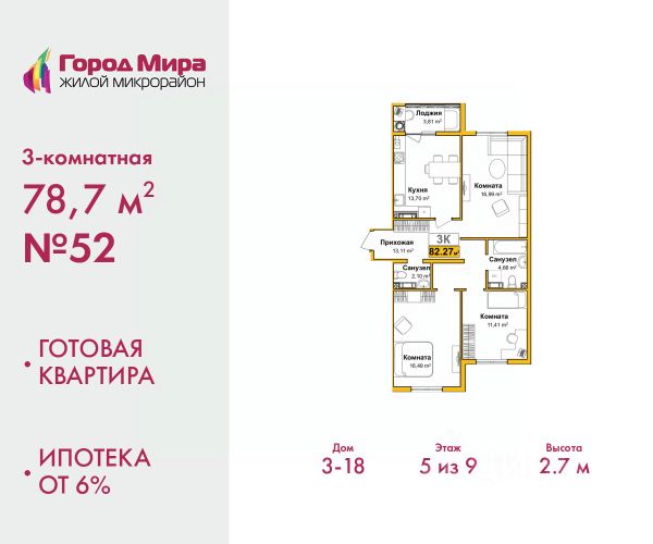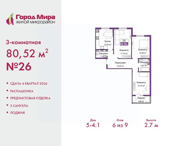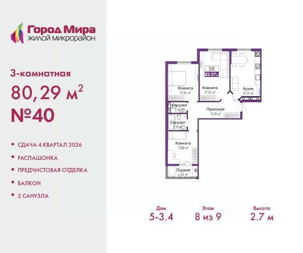 Продается трехкомнатная квартира с предчистовой отделкой в ЖМ "Город Мира" на 2 этаже. Общая площадь: 79.77 кв.м., жилая: 45.41 кв.м., площадь просторной кухни-столовой: 11.9 кв.м. Квартира - распашонка, без проходных комнат, окна выходят на paзные стороны дома. В квартире одна лоджия, один совмещенный и один раздельный санузел. Высота потолков 2.7 м. Жилой комплекс "Город Мира" комфорт и гармония в современном формате. "Город Мира" это масштабный жилой комплекс, созданный для тех, кто ценит комфорт, безопасность и гармонию с природой. Здесь продумана каждая деталь от удобной инфраструктуры до эргономичных планировок квартир. В 2024 году микрорайон "Город Мира" победил в номинации "Лучший экологический проект года в сфере строительства" по версии премии Crimea Urban Awards. Ключевые преимущества комплекса: - удачное расположение зеленый район с благоприятным микроклиматом - продуманное зонирование жилые кварталы, зоны отдыха и коммерческие объекты - комфорт-класс высокое качество строительства и современные инженерные решения Инфраструктура "Города Мира": Образование и досуг: - 2 детских сада (по 260 мест каждый) - планируется строительство общеобразовательной школы - детские и спортивные площадки в каждом дворе - беседки для отдыха, зоны для выгула собак Ритейл и сервис: - магазины, аптеки, медицинские центры - фитнес-клубы, салоны красоты - детские развивающие центры Парковки: - гостевые парковки - наземные и подземные паркинги Квартиры с продуманным комфортом: - просторные планировки с кладовыми и колясочными - лоджии с остеклением - автономное отопление (по 23 дому: индивидуальное отопление) - выполнена стяжка пола (по 3, 4, 20, 21, 22 домам: выполненная стяжка пола и штукатурка стен) - Консьерж-сервис для дополнительного удобства Благоустройство территории: - ландшафтный дизайн с зонами отдыха - современные детские площадки - стильные холлы с дизайнерской отделкой - система видеонаблюдения для безопасности "Город Мира" это место, где созданы все условия для комфортной жизни. Выбирайте качество и продуманность в каждой детали! Квартира находится в корпусе 3_21. Дом монолитный, одноподъездный, высотой 9 этажей. В подъезде 1 грузовой лифт. Окончание строительства - 1 квартал 2026 года. Оформление сделки по договору долевого участия. #Z6DaDa 3-комнатной квартиры в ипотеку в Симферополе.