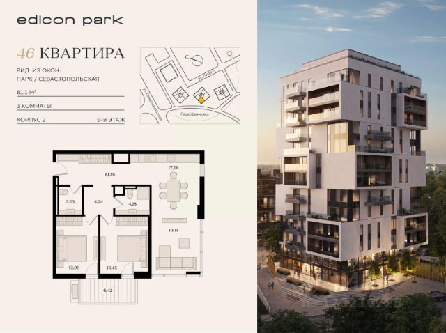 м; удобные двухкомнатные от 64,6 кв. м; просторные трёхкомнатные 87,7 кв. м.
