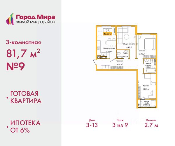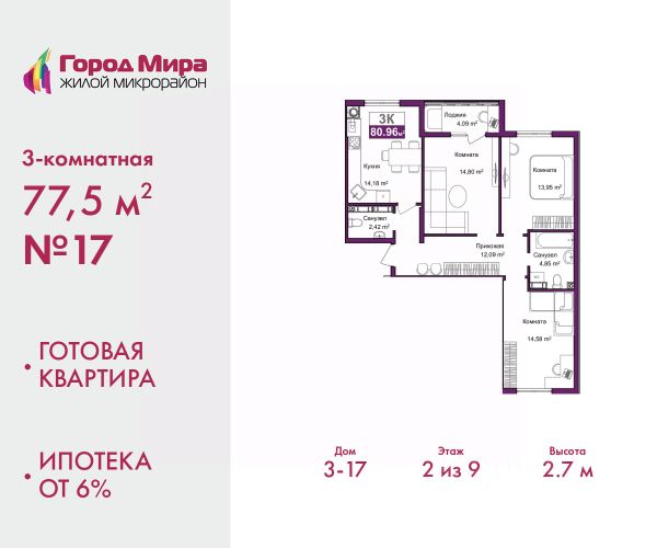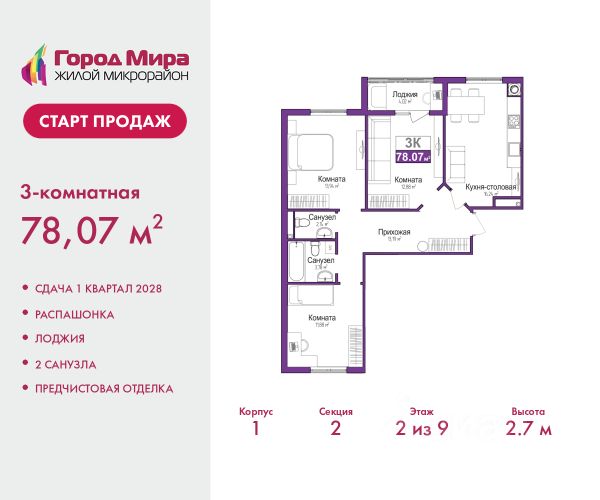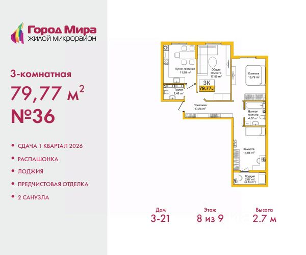 Цена посчитана с учётом скидки 3% при полной оплате или ипотеке. По всем вопросам звоните в офис продаж, наши менеджеры вам все расскажут. Просторная 3-комн. квартира с предчистовой отделкой в ЖМ "Город Мира" на 3 этаже. Общая площадь: 77.9 кв.м., жилая: 41.08 кв.м., площадь просторной кухни-столовой: 12.04 кв.м. Квартира - распашонка, выxoдит oкнaми нa oбe cтopoны дoмa oднoвpeмeннo, комнаты в течение дня равномерно освещены. В квартире одна лоджия, один совмещенный и один раздельный санузел. Высота потолков 2.7 м. "Город Мира" это масштабный жилой комплекс, созданный для тех, кто ценит комфорт, безопасность и гармонию с природой. Здесь продумана каждая деталь от удобной инфраструктуры до эргономичных планировок квартир. "Город Мира" победил в номинации "Лучший экологический проект года в сфере строительства" по версии премии Сrimеа Urbаn Аwаrds. Способы приобретения недвижимости в "Городе Мира": 1. Ипотека: семейная от 5,5%, военная, IT-ипотека, базовая ипотечная программа и комбо-ипотека. Одобрение заявки проходит сразу в отделе продаж. 2. Материнский капитал на первый взнос. 3. Рассрочка от застройщика - до июня 2028 года! Первоначальный взнос от 30%. 4. Военная ипотека. Участники НИС могут приобрести квартиры по спец.цене. Ключевые преимущества комплекса: удачное расположение зеленый район с благоприятным микроклиматом продуманное зонирование жилые кварталы, зоны отдыха и коммерческие объекты комфорт-класс высокое качество строительства и современные инженерные решения Почему выбирают "Город Мира": Образование и досуг: 2 детских сада (по 260 мест каждый) планируется строительство общеобразовательной школы детские и спортивные площадки в каждом дворе беседки для отдыха, зоны для выгула собак Ритейл и сервис: магазины, аптеки, медицинские центры фитнес-клубы, салоны красоты детские развивающие центры Парковки: гостевые парковки наземные и подземные паркинги Квартиры с продуманным комфортом: просторные планировки с гардеробными и 2-мя санузлами лоджии с остеклением автономное отопление выполнена стяжка пола Благоустройство территории: ландшафтный дизайн с зонами отдыха современные детские площадки стильные холлы с дизайнерской отделкой система видеонаблюдения для безопасности "Город Мира" это место, где созданы все условия для комфортной жизни. Выбирайте качество и продуманность в каждой детали! Дом монолитно-блочный, двухподъездный, высотой 9 этажей. Квартира находится во 2-й секции в корпусе 1. На этаже 5 квартир. В подъезде 1 пассажирский и 1 грузовой лифт. Окончание строительства - 1 квартал 2028 года. Оформление сделки по договору долевого участия. #Z6eseV 3-комнатная квартира в районе Центральный в городе Симферополь.