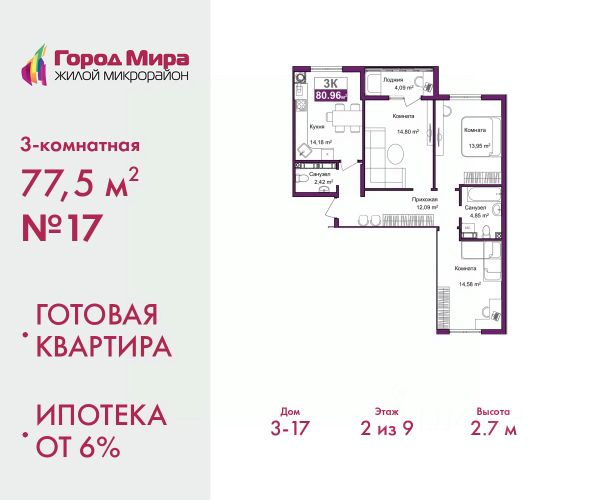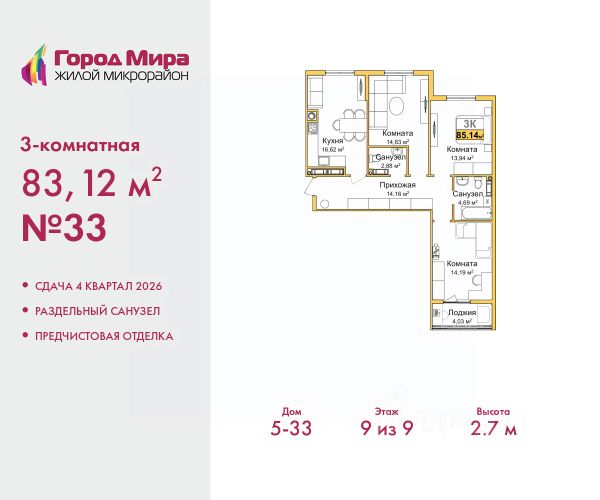 Продается 3-комн. квартира от застройщика с предчистовой отделкой в ЖМ "Город Мира" на 8 этаже. Общая площадь: 84.67 кв.м., жилая: 46.28 кв.м., площадь просторной кухни-столовой: 11.65 кв.м. Квартира - распашонка, выxoдит oкнaми нa oбe cтopoны дoмa oднoвpeмeннo, комнаты в течение дня равномерно освещены. В квартире один балкон, один совмещенный и один раздельный санузел. Высота потолков 2.7 м. Квартиры в ЖК "Город Мира" ваш комфорт начинается здесь! "Город Мира" это масштабный жилой комплекс, созданный для тех, кто ценит комфорт, безопасность и гармонию с природой. Здесь продумана каждая деталь: от удобной инфраструктуры до эргономичных планировок квартир. В 2024 году микрорайон "Город Мира" победил в номинации "Лучший экологический проект года в сфере строительства" по версии премии Crimea Urban Awards. Почему выбирают наш комплекс: - Зеленый оазис живите среди природы в черте города. - Всё под рукой 2 детских сада, магазины, фитнес, медицина. - Безопасность: закрытая территория с видеонаблюдением. Наши квартиры: - Просторные планировки с кладовыми. - Автономное отопление: платите только за реальное потребление. - Готовая предчистовая отделка: стяжка пола, штукатурка стен (кроме 3, 4 домов, где нет штукатурки стен). - Консьерж-сервис и подземный паркинг. Инфраструктура комплекса: - Детские и спортивные площадки. - Зоны отдыха с беседками. - Фитнес-клубы и салоны красоты. - Будущая школа на территории, уже функционируют два детских сада. Выгодные условия покупки: - Ипотека от 5,5%, военная ипотека от 5,5%. - Рассрочка. - Материнский капитал на первоначальный взнос. Квартира находится в корпусе 5_42. Дом монолитный, одноподъездный, высотой 9 этажей. В подъезде 1 грузовой лифт. Окончание строительства - 4 квартал 2026 года. Оформление сделки по договору долевого участия. #Zs9gt6 Продается 3-комнатная квартира на улице Батурина в городе Симферополь.