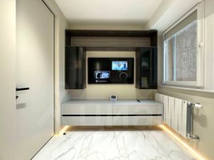 Гардеробная 3,3 м2, в которой удобно расположить вещи, продуманы также отделения для хранения солнцезащитных очков, ключей, документов и других необходимых вещей. Оснащена вентиляцией, оборудована специальной техникой для просушки вещей и обуви.