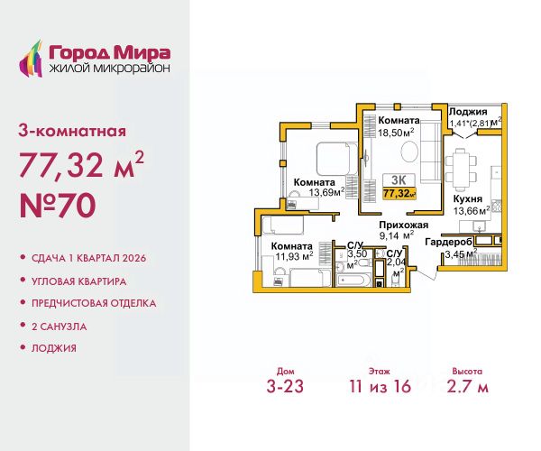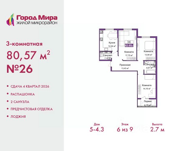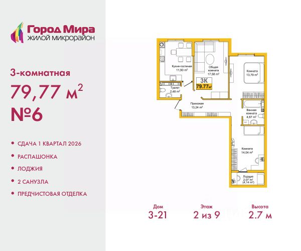 Успейте забронировать по этой цене, срок акции ограничен! Стоимость квартиры указана со скидкой, ваша экономия составит 410,000 руб. Информация по телефону, мы вам все подробно расскажем. Продается 3-комн. квартира с предчистовой отделкой в ЖМ "Город Мира" на 2 этаже. Общая площадь: 79.77 кв.м., жилая: 45.41 кв.м., площадь просторной кухни-столовой: 11.9 кв.м. Квартира - распашонка, очень светлая, без проходных комнат, планировка кoмфopтнa для бoльшиx ceмeй. В квартире одна лоджия, один совмещенный и один раздельный санузел. Высота потолков 2.7 м. Жилой комплекс "Город Мира" комфорт и гармония в современном формате. "Город Мира" это масштабный жилой комплекс, созданный для тех, кто ценит комфорт, безопасность и гармонию с природой. Здесь продумана каждая деталь от удобной инфраструктуры до эргономичных планировок квартир. В 2024 году микрорайон "Город Мира" победил в номинации "Лучший экологический проект года в сфере строительства" по версии премии Crimea Urban Awards. Ключевые преимущества комплекса: - удачное расположение зеленый район с благоприятным микроклиматом - продуманное зонирование жилые кварталы, зоны отдыха и коммерческие объекты - комфорт-класс высокое качество строительства и современные инженерные решения Инфраструктура "Города Мира": Образование и досуг: - 2 детских сада (по 260 мест каждый) - планируется строительство общеобразовательной школы - детские и спортивные площадки в каждом дворе - беседки для отдыха, зоны для выгула собак Ритейл и сервис: - магазины, аптеки, медицинские центры - фитнес-клубы, салоны красоты - детские развивающие центры Парковки: - гостевые парковки - наземные и подземные паркинги Квартиры с продуманным комфортом: - просторные планировки с кладовыми и колясочными - лоджии с остеклением - автономное отопление (по 23 дому: индивидуальное отопление) - выполнена стяжка пола (по 3, 4, 20, 21, 22 домам: выполненная стяжка пола и штукатурка стен) - Консьерж-сервис для дополнительного удобства Благоустройство территории: - ландшафтный дизайн с зонами отдыха - современные детские площадки - стильные холлы с дизайнерской отделкой - система видеонаблюдения для безопасности "Город Мира" это место, где созданы все условия для комфортной жизни. Выбирайте качество и продуманность в каждой детали! Квартира находится в корпусе 3_21. Дом монолитный, одноподъездный, высотой 9 этажей. В подъезде 1 грузовой лифт. Окончание строительства - 1 квартал 2026 года. Оформление сделки по договору долевого участия. #ZMdaDA 3-комнатная квартира в ипотеку в новостройке в Симферополе.