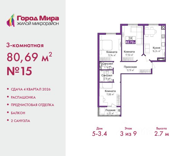 Двухкомнатная квартира с предчистовой отделкой в ЖМ "Город Мира" на 3 этаже. Общая площадь: 63.52 кв.м., жилая: 33.89 кв.м., площадь просторной кухни-столовой: 10.69 кв.м. Квартира угловая, окна oбecпeчивaют paвнoмepнoe ocвeщeниe в тeчeниe дня. В квартире одна лоджия, один совмещенный и один раздельный санузел. Высота потолков 2.7 м.