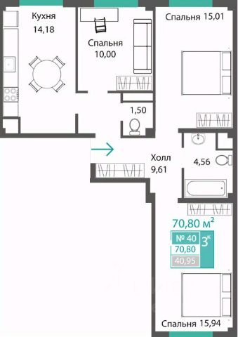 Находится на 3 этаже 4-этажного дома. Общая площадь 49,6 м2.