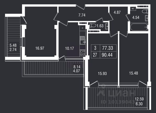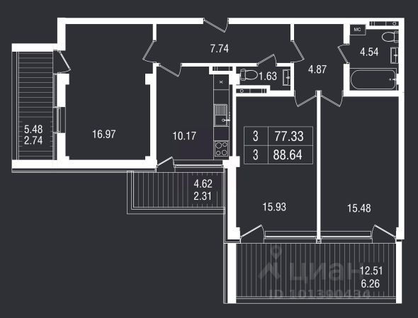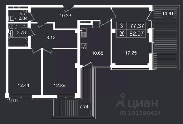 Сам апартамент включает в себя три изолированные просторные спальни, для каждого найдётся место. Кухня 4,65 кв. м., Санузел и просторная прихожая, в которой можно выделить место под гардеробную.