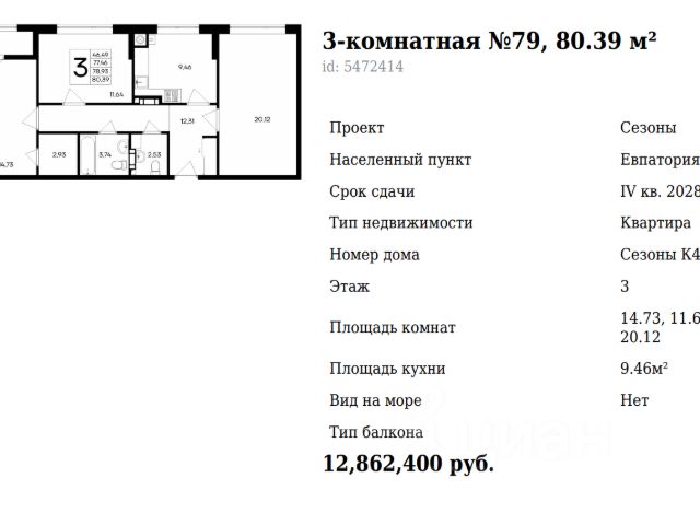 Цены от застройщика Без комиссии для покупателя Ипотека в банках: Сбер, ВТБ, Банк Россия, Генбанк. Вид квартиры во двор + улицу. Рассрочка-ПВ от 30% и остаток равными платежами без переплат до декабря 2027 года. При 100 % оплате или ипотеке предоставляется скидка 3%. В домах 3 и 4 — квартиры сдаются с отделкой White box. В доме 1 и 2 — квартиры с черновой отделкой, перегородки выполнены в один камень. В продаже лоты на выбор от 35.28 - 80.39 м2 В продаже квартиры с предчистовой отделкой White Box вам остается только внести финальные штрихи по своему вкусу. В доме 1,2 квартиры сдаются в черновой отделке. В домах 3 и 4 все квартиры будут сдаваться с отделкой White box. Жилой комплекс "Сезоны" в солнечной Евпатории В Евпатории солнце светит 258 дней в году! В городе у моря каждый день особенный! Лето приносит свежесть морского бриза, осень мягкость теплых тонов, зима уют домашнего очага, а весна пробуждение природы. В жилом комплексе "Сезоны" вы найдете свой идеальный уголок для жизни в любое время года! Евпатория город, где солнце живёт круглый год Этот живописный курорт в Крыму на берегу Каламитского залива славится уникальным климатом и целебной природой. С одной стороны город омывают воды Мойнакского озера с уникальными лечебными грязями, с другой розовое соленое озеро Сасык-Сиваш, известное своими оздоровительными свойствами. Современный жилой комплекс для жизни с комфортом "Сезоны" это 12 домов переменной этажности, где всё продумано до мелочей. На территории будет построен современный двухэтажный торговый центр, всё необходимое в шаговой доступности. Первый этап строительства включает четыре дома с секциями на 7, 8 и 9 этажей. Расположение комплекса в перспективном районе Евпатории, неподалёку от проспекта Победы. Удобные подъездные пути и транспортная доступность делают локацию особенно привлекательной. Евпатория город, где история встречается с современностью Прогуляйтесь по уютным улицам, любуясь памятниками архитектуры, фонтанами и ротондами. Побывайте в парках и музеях, откройте для себя древнюю историю города. А море, солнце, фрукты и развлечения сделают каждый ваш день незабываемым! Жилой комплекс "Сезоны" дарит вдохновение и комфорт круглый год. Безусловные преимущества -приватные дворы без машин -индивидуальное отопление -дизайнерские холлы -просторные бесшумные лифты -ландшафтное озеленение с автополивом -современные детские игровые площадки -пространства для отдыха всей семьи -удобные парковочные места и колясочные -кладовые для сезонных вещей -полная безбарьерная среда Выбор планировок для любых потребностей: -уютные однокомнатные от 31 до 46 м² -функциональные двухкомнатные от 57 до 62 м² -просторные трёхкомнатные квартиры 80 м² -Все квартиры имеют остекленные лоджии. Локация в центре возможностей: -Центральная городская набережная 6 км -Ближайший пляж 5 км -Аквапарк 6 км -Аэропорт 68 км -ЖД-вокзал Симферополя 90 км Покупайте с нами
