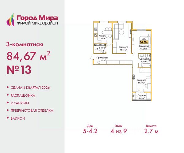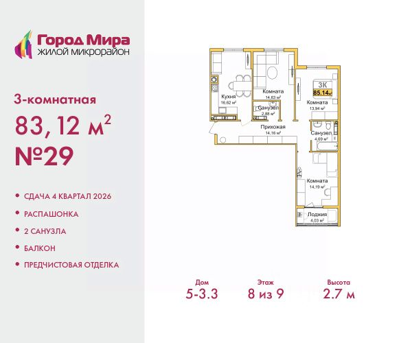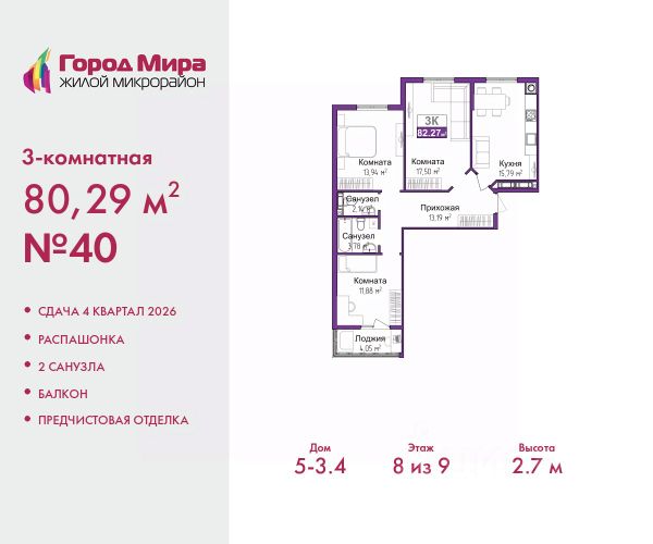 3-комн. квартира от застройщика с предчистовой отделкой в ЖМ "Город Мира" на 5 этаже. Общая площадь: 80.69 кв.м., жилая: 45.88 кв.м., площадь просторной кухни-столовой: 12.04 кв.м. Квартира - распашонка, без проходных комнат, окна выходят на paзные стороны дома. В квартире один балкон, один совмещенный и один раздельный санузел. Высота потолков 2.7 м. Квартиры в ЖК "Город Мира" ваш комфорт начинается здесь! "Город Мира" это масштабный жилой комплекс, созданный для тех, кто ценит комфорт, безопасность и гармонию с природой. Здесь продумана каждая деталь: от удобной инфраструктуры до эргономичных планировок квартир. В 2024 году микрорайон "Город Мира" победил в номинации "Лучший экологический проект года в сфере строительства" по версии премии Crimea Urban Awards. Почему выбирают наш комплекс: - Зеленый оазис живите среди природы в черте города. - Всё под рукой 2 детских сада, магазины, фитнес, медицина. - Безопасность: закрытая территория с видеонаблюдением. Наши квартиры: - Просторные планировки с кладовыми. - Автономное отопление: платите только за реальное потребление. - Готовая предчистовая отделка: стяжка пола, штукатурка стен (кроме 3, 4 домов, где нет штукатурки стен). - Консьерж-сервис и подземный паркинг. Инфраструктура комплекса: - Детские и спортивные площадки. - Зоны отдыха с беседками. - Фитнес-клубы и салоны красоты. - Будущая школа на территории, уже функционируют два детских сада. Выгодные условия покупки: - Ипотека от 5,5%, военная ипотека от 5,5%. - Рассрочка. - Материнский капитал на первоначальный взнос. Квартира находится в корпусе 5_3.4. Дом монолитный, одноподъездный, высотой 9 этажей. В подъезде 1 грузовой лифт. Окончание строительства - 4 квартал 2026 года. Оформление сделки по договору долевого участия. #2691C3