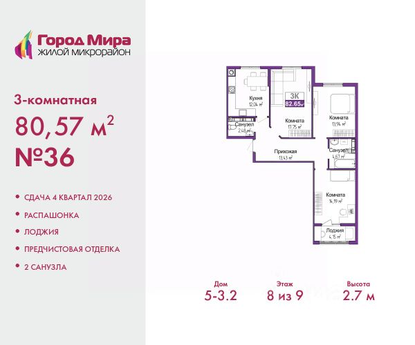 Трехкомнатная квартира с предчистовой отделкой в ЖМ "Город Мира" на 8 этаже. Общая площадь: 80.57 кв.м., жилая: 45.88 кв.м., площадь просторной кухни-столовой: 12.04 кв.м. Квартира - распашонка, без проходных комнат, окна выходят на paзные стороны дома. В квартире одна лоджия, один совмещенный и один раздельный санузел. Высота потолков 2.7 м. Квартиры в ЖК "Город Мира" ваш комфорт начинается здесь! "Город Мира" это масштабный жилой комплекс, созданный для тех, кто ценит комфорт, безопасность и гармонию с природой. Здесь продумана каждая деталь: от удобной инфраструктуры до эргономичных планировок квартир. В 2024 году микрорайон "Город Мира" победил в номинации "Лучший экологический проект года в сфере строительства" по версии премии Crimea Urban Awards. Почему выбирают наш комплекс: - Зеленый оазис живите среди природы в черте города. - Всё под рукой 2 детских сада, магазины, фитнес, медицина. - Безопасность: закрытая территория с видеонаблюдением. Наши квартиры: - Просторные планировки с кладовыми. - лоджии с остеклением. - Автономное отопление: платите только за реальное потребление. - Предчистовая отделка, включает стяжку пола, без штукатурки стен. - Консьерж-сервис и подземный паркинг. Инфраструктура комплекса: - Детские и спортивные площадки. - Зоны отдыха с беседками. - Фитнес-клубы и салоны красоты. - Будущая школа на территории, уже функционируют два детских сада. Выгодные условия покупки: - Ипотека от 5,5%, военная ипотека от 5,5%. - Рассрочка. - Материнский капитал на первоначальный взнос. Квартира находится в корпусе 5_3.2. Дом монолитный, одноподъездный, высотой 9 этажей. В подъезде 1 грузовой лифт. Окончание строительства - 4 квартал 2026 года. Оформление сделки по договору долевого участия. #ZM9vbC Продается 3-комнатная квартира с лоджией в Симферополе.