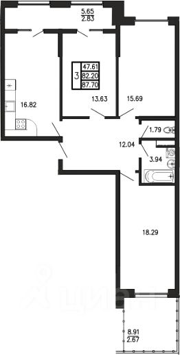 Планировка включает в себя просторную прихожую, три жилые комнаты, кухню, раздельный санузел и два балкона.