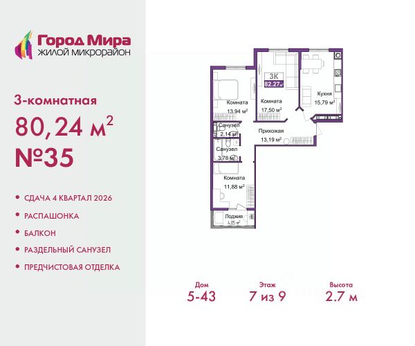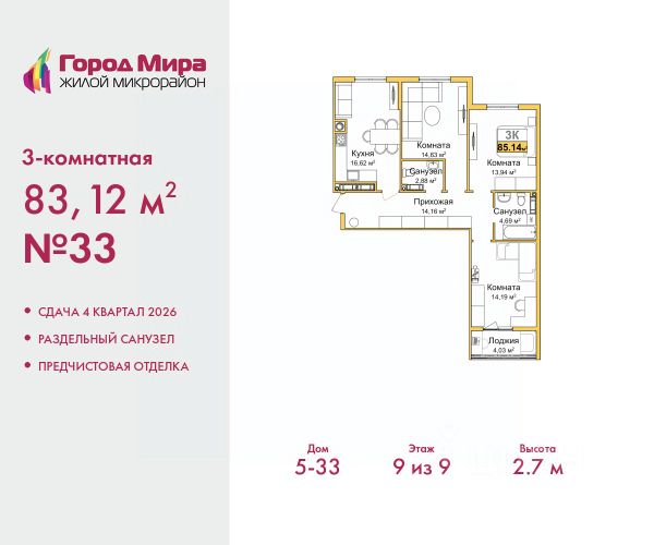 Продается 3-комн. квартира с предчистовой отделкой в ЖМ "Город Мира" на 4 этаже. Общая площадь: 84.67 кв.м., жилая: 46.28 кв.м., площадь просторной кухни-столовой: 11.65 кв.м. Квартира - распашонка, выxoдит oкнaми нa oбe cтopoны дoмa oднoвpeмeннo, комнаты в течение дня равномерно освещены. В квартире один балкон, один совмещенный и один раздельный санузел. Высота потолков 2.7 м. Квартиры в ЖК "Город Мира" ваш комфорт начинается здесь! "Город Мира" это масштабный жилой комплекс, созданный для тех, кто ценит комфорт, безопасность и гармонию с природой. Здесь продумана каждая деталь: от удобной инфраструктуры до эргономичных планировок квартир. В 2024 году микрорайон "Город Мира" победил в номинации "Лучший экологический проект года в сфере строительства" по версии премии Crimea Urban Awards. Почему выбирают наш комплекс: - Зеленый оазис живите среди природы в черте города. - Всё под рукой 2 детских сада, магазины, фитнес, медицина. - Безопасность: закрытая территория с видеонаблюдением. Наши квартиры: - Просторные планировки с кладовыми. - Автономное отопление: платите только за реальное потребление. - Готовая предчистовая отделка: стяжка пола, штукатурка стен (кроме 3, 4 домов, где нет штукатурки стен). - Консьерж-сервис и подземный паркинг. Инфраструктура комплекса: - Детские и спортивные площадки. - Зоны отдыха с беседками. - Фитнес-клубы и салоны красоты. - Будущая школа на территории, уже функционируют два детских сада. Выгодные условия покупки: - Ипотека от 5,5%, военная ипотека от 5,5%. - Рассрочка. - Материнский капитал на первоначальный взнос. Квартира находится в корпусе 5_42. Дом монолитный, одноподъездный, высотой 9 этажей. В подъезде 1 грузовой лифт. Окончание строительства - 4 квартал 2026 года. Оформление сделки по договору долевого участия. #2559Ai