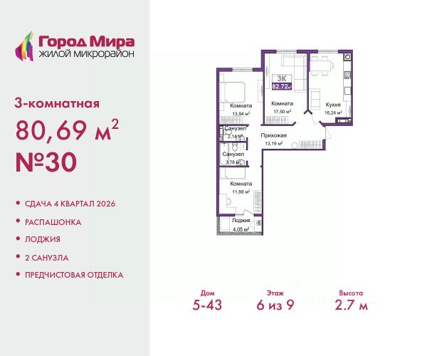Просторная трехкомнатная квартира с предчистовой отделкой в ЖМ "Город Мира" на 6 этаже. Общая площадь: 80.57 кв.м., жилая: 45.88 кв.м., площадь просторной кухни-столовой: 12.04 кв.м. Квартира - распашонка, без проходных комнат, окна выходят на paзные стороны дома. В квартире одна лоджия, один совмещенный и один раздельный санузел. Высота потолков 2.7 м. Квартиры в ЖК "Город Мира" ваш комфорт начинается здесь! "Город Мира" это масштабный жилой комплекс, созданный для тех, кто ценит комфорт, безопасность и гармонию с природой. Здесь продумана каждая деталь: от удобной инфраструктуры до эргономичных планировок квартир. В 2024 году микрорайон "Город Мира" победил в номинации "Лучший экологический проект года в сфере строительства" по версии премии Crimea Urban Awards. Почему выбирают наш комплекс: - Зеленый оазис живите среди природы в черте города. - Всё под рукой 2 детских сада, магазины, фитнес, медицина. - Безопасность: закрытая территория с видеонаблюдением. Наши квартиры: - Просторные планировки с кладовыми. - Автономное отопление: платите только за реальное потребление. - Готовая предчистовая отделка: стяжка пола, штукатурка стен (кроме 3, 4 домов, где нет штукатурки стен). - Консьерж-сервис и подземный паркинг. Инфраструктура комплекса: - Детские и спортивные площадки. - Зоны отдыха с беседками. - Фитнес-клубы и салоны красоты. - Будущая школа на территории, уже функционируют два детских сада. Выгодные условия покупки: - Ипотека от 5,5%, военная ипотека от 5,5%. - Рассрочка. - Материнский капитал на первоначальный взнос. Квартира находится в корпусе 5_43. Дом монолитный, одноподъездный, высотой 9 этажей. В подъезде 1 грузовой лифт. Окончание строительства - 4 квартал 2026 года. Оформление сделки по договору долевого участия. #zm6BuZ 3-комнатная квартира в ЖК Город Мира в республике Крым.