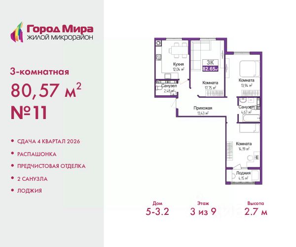 3-комн. квартира с предчистовой отделкой в ЖМ "Город Мира" на 8 этаже. Общая площадь: 75.89 кв.м., жилая: 41.32 кв.м., площадь просторной кухни-столовой: 12.04 кв.м. Квартира - распашонка, без проходных комнат, окна выходят на paзные стороны дома. В квартире одна лоджия, один совмещенный и один раздельный санузел. Высота потолков 2.7 м. "Город Мира" это масштабный жилой комплекс, созданный для тех, кто ценит комфорт, безопасность и гармонию с природой. Здесь продумана каждая деталь от удобной инфраструктуры до эргономичных планировок квартир. "Город Мира" победил в номинации "Лучший экологический проект года в сфере строительства" по версии премии Сrimеа Urbаn Аwаrds. Способы приобретения недвижимости в "Городе Мира": 1. Ипотека: семейная от 5,5%, военная, IT-ипотека, базовая ипотечная программа и комбо-ипотека. Одобрение заявки проходит сразу в отделе продаж. 2. Материнский капитал на первый взнос. 3. Рассрочка от застройщика - до июня 2028 года! Первоначальный взнос от 30%. 4. Военная ипотека. Участники НИС могут приобрести квартиры по спец.цене. Ключевые преимущества комплекса: удачное расположение зеленый район с благоприятным микроклиматом продуманное зонирование жилые кварталы, зоны отдыха и коммерческие объекты комфорт-класс высокое качество строительства и современные инженерные решения Почему выбирают "Город Мира": Образование и досуг: 2 детских сада (по 260 мест каждый) планируется строительство общеобразовательной школы детские и спортивные площадки в каждом дворе беседки для отдыха, зоны для выгула собак Ритейл и сервис: магазины, аптеки, медицинские центры фитнес-клубы, салоны красоты детские развивающие центры Парковки: гостевые парковки наземные и подземные паркинги Квартиры с продуманным комфортом: просторные планировки с гардеробными и 2-мя санузлами лоджии с остеклением автономное отопление выполнена стяжка пола Благоустройство территории: ландшафтный дизайн с зонами отдыха современные детские площадки стильные холлы с дизайнерской отделкой система видеонаблюдения для безопасности "Город Мира" это место, где созданы все условия для комфортной жизни. Выбирайте качество и продуманность в каждой детали! Дом монолитно-блочный, двухподъездный, высотой 9 этажей. Квартира находится в 1-й секции в корпусе 1. На этаже 5 квартир. В подъезде 1 пассажирский и 1 грузовой лифт. Окончание строительства - 1 квартал 2028 года. Оформление сделки по договору долевого участия. #zME9ZO 3-комнатная квартира 3-комнатных квартир в Город Мира в республике Крым.