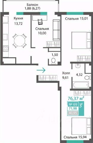 Продаётся 3-комнатная квартира в строящемся доме (ЭТАП 1, СЕКЦИИ А1, А2, А3), срок сдачи: III-кв. 2028, общей площадью 71.65 кв.м., на 2 этаже. Новый жилой комплекс "Семейный квартал ПРОПОЛИС" от застройщика "Монолит" расположен по адресу: Республика Крым, Симферопольский район, с. Мирное, ул. Учительская