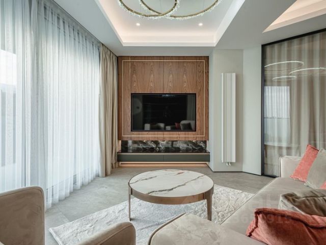 Отопление: центральная система отопления, электрический теплый пол, водяной теплый пол, внутрипольный конвектор в зоне гостиной, в спальных зонах радиаторное отопление.