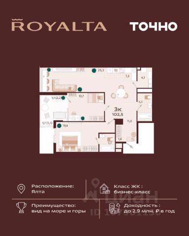 При звонке назовите, пожалуйста, объекта 541020 БЕЗ КОМИССИИ ДЛЯ ПОКУПАТЕЛЯ! Преимущества: Закрытый дом комфорт-класса. Подземный паркинг. Чистый морской воздух, хвойные деревья вблизи и экологичный район. Близость парков. Виды на хвойный лес, море и горы Комплекс апартаментов расположен вблизи Ялты. Великолепные горно-морские пейзажи, виноградники и чистейшие, преимущественно галечные пляжи с прозрачной водой Южного Берега Крыма привлекают внимание даже самых взыскательных путешественников. Местный климат схож с Лазурным Берегом Франции, особенно с курортами Ниццей и Каннами. Это идеальное место для круглогодичного отдыха и жизни у моря. Апарт-комплекс выполнен в классическом южном стиле, светлые оттенки и фактура здания органично вписываются в природный ландшафт южного берега Крыма. Восемь этажей с потрясающими видами на хвойный лес, горы и море. Планировки с одной или тремя комнатами подойдут для комфортного размещения взрослых пар, семей с детьми или больших компаний. Видовые характеристики очаруют даже опытных путешественников. С террасы верхних этажей открывается головокружительная панорама на неповторимую природу крымского побережья, Черное море и горы. Особенность комплекса - гармоничный ландшафт, озеленение внутренней среды, удачно дополняющие местные природные виды. Продуманная инфраструктура, удобные подъездные пути и собственный паркинг - приятное дополнение для жителей апарт-комплекса. В Ливадии находится одна из самых известных достопримечательностей Крыма - Летняя Резиденция Императора Николая II. Царская семья очень любила отдыхать здесь. Целебный воздух, спускаясь с гор, смешивается с морским, образуя оздоравливающий коктейль, полезный для каждого человека. В шаговой доступности от комплекса - Приморский парк с многочисленными бутиками, кафе, ресторанами и Spa-центром, а также знаменитым оборудованным пляжем "Дельфин". Апарт-комплекс - сочетание комфортного уединенного отдыха в окружении незабываемых крымских пейзажей с насыщенной и увлекательной инфраструктурой Ялты. * актуальную стоимость и наличие конкретного объекта уточняйте по телефону. Номер объекта: #1/541020/17283