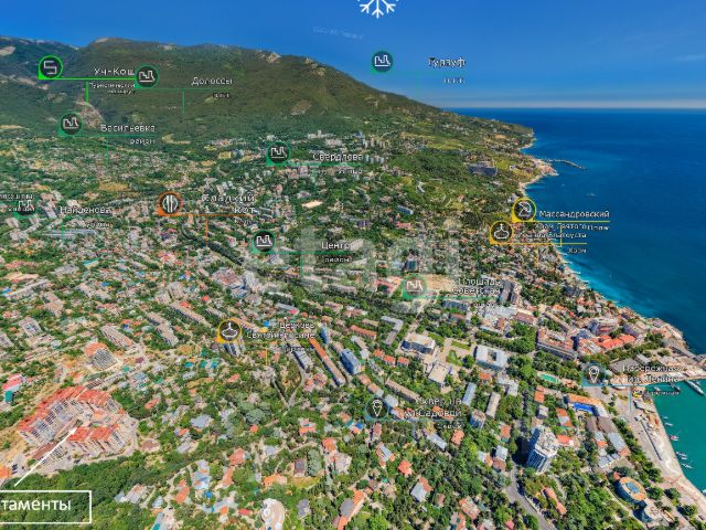 Панорамное остекление открывает завораживающие виды сразу на два направления: бескрайнее Черное море с Ялтинским маяком и величественный горный массив.
