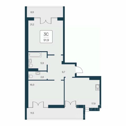 - Общая площадь — 104 м² (жилая — 89,5 м², просторный балкон — 14,5 м²)