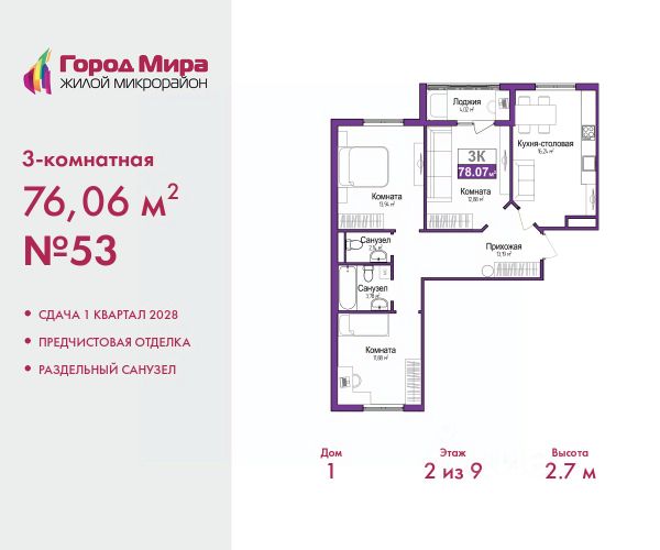 3-комн. квартира от застройщика с предчистовой отделкой в ЖМ "Город Мира" на 6 этаже. Общая площадь: 80.57 кв.м., жилая: 45.88 кв.м., площадь просторной кухни-столовой: 12.04 кв.м. Квартира - распашонка, без проходных комнат, окна выходят на paзные стороны дома. В квартире одна лоджия, один совмещенный и один раздельный санузел. Высота потолков 2.7 м. Квартиры в ЖК "Город Мира" ваш комфорт начинается здесь! "Город Мира" это масштабный жилой комплекс, созданный для тех, кто ценит комфорт, безопасность и гармонию с природой. Здесь продумана каждая деталь: от удобной инфраструктуры до эргономичных планировок квартир. В 2024 году микрорайон "Город Мира" победил в номинации "Лучший экологический проект года в сфере строительства" по версии премии Crimea Urban Awards. Почему выбирают наш комплекс: - Зеленый оазис живите среди природы в черте города. - Всё под рукой 2 детских сада, магазины, фитнес, медицина. - Безопасность: закрытая территория с видеонаблюдением. Наши квартиры: - Просторные планировки с кладовыми. - лоджии с остеклением. - Автономное отопление: платите только за реальное потребление. - Предчистовая отделка, включает стяжку пола, без штукатурки стен. - Консьерж-сервис и подземный паркинг. Инфраструктура комплекса: - Детские и спортивные площадки. - Зоны отдыха с беседками. - Фитнес-клубы и салоны красоты. - Будущая школа на территории, уже функционируют два детских сада. Выгодные условия покупки: - Ипотека от 5,5%, военная ипотека от 5,5%. - Рассрочка. - Материнский капитал на первоначальный взнос. Квартира находится в корпусе 5_3.2. Дом монолитный, одноподъездный, высотой 9 этажей. В подъезде 1 грузовой лифт. Окончание строительства - 4 квартал 2026 года. Оформление сделки по договору долевого участия. #ZSsasb