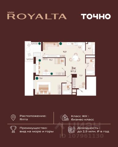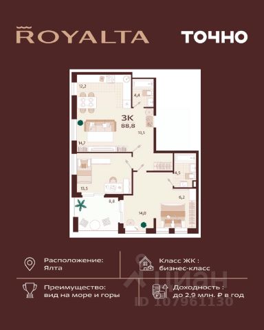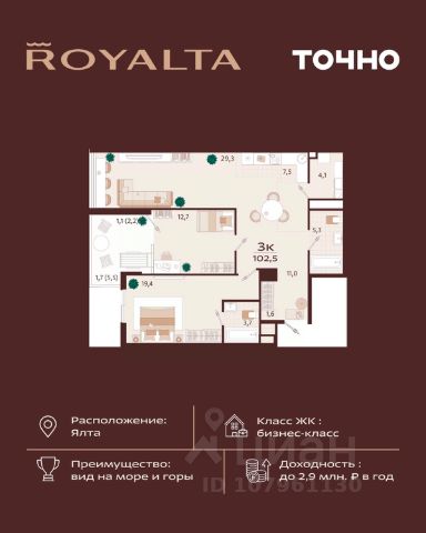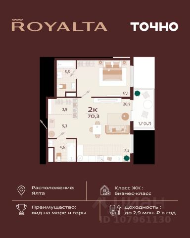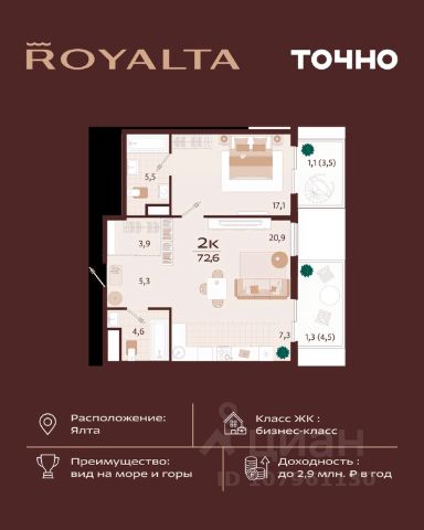 Жилой комплекс "РОЯЛТА" включает 5 монолитно-кирпичных девятиэтажных зданий. Проект предлагает квартиры различных планировок: от однокомнатных до трехкомнатных с расширенными балконами и террасами до 13,4 м2. Территория будет благоустроена детскими игровыми и спортивными площадками, гостевой автостоянкой и озеленением, включая газоны, деревья и кустарники. Также появятся современные уличные тренажёры, СПА-комплекс и панорамный инфинити-бассейн. В шаговой доступности находятся центральная набережная Ялты, детские сады, школы, супермаркеты, торговые центры, Ялтинский медицинский колледж, автовокзал и Мордвиновский парк.