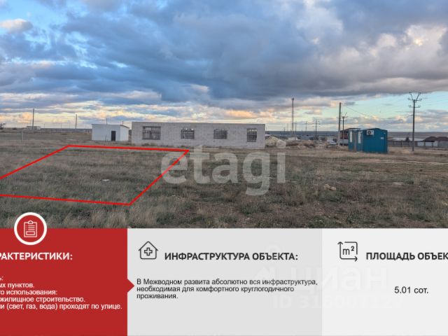 В продаже земля ИЖС, 5 соток в пос. Межводное на ул. Тарханкутская. Участок ровный, находится в 200 м от моря. Проведен газопровод. Вид с участка открывается на море и озеро. Коммуникации все рядом, вокруг жилая застройка.
