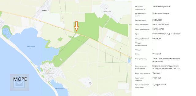 Продается уникальный участок расположенном в живописном Штормовском сельском поселении Сакского района Республики Крым, всего в 8 км от моря и в 7 км от курортного посёлка Штормовое, в 1,5 км от пгт. Новоозерное. Площадь участка составляет 533 сотки, что предоставляет большие возможности для реализации ваших идей. Участок имеет сельскохозяйственное назначение приватизирован, что открывает перед вами широкий спектр применения — от организации сельхоздеятельности до строительства курортных домиков на сваях. Участок находится в перспективном месте с удобным доступом к инфраструктуре. Вы можете легко подвести электроэнергию и водопровод ( скважина) , что значительно упростит процесс застройки. Прекрасный вариант для тех, кто хочет создать уникальный уголок на природе или инвестировать в будущее. Также стоит отметить, что имеется возможность приобретения участка в ипотеку через Сбербанк, что делает покупку еще более доступной и привлекательной. Дорога к участку грунтовая, а общественный транспорт, включая автобус, обеспечивает комфортный доступ в окрестные населенные пункты. Этот участок не разработан и готов к тому, чтобы стать вашим новым проектом. Для вашего удобства я готова провести онлайн-показ, чтобы вы могли ознакомиться с объектом, не выходя из дома. Не упустите шанс стать владельцем этого замечательного участка в прекрасном уголке Крыма! Кадастровый номер участка: 90:11:240601:265. При звонке сообщите нам, пожалуйста, номер: Z476