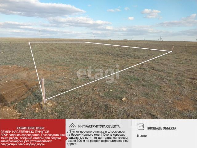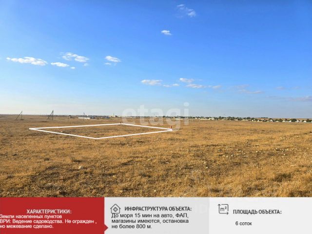 Расстояние до г. Евпатория — всего 25 км, добраться можно за 20 минут на маршрутке (по расписанию) или за 10 минут на автомобиле. Все документы оформлены по российским стандартам. Участки находятся в собственности, без участия посредников.