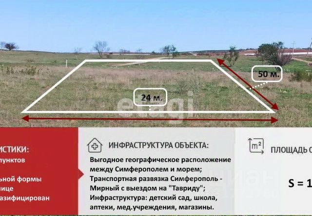 Продаю участок под застройку. Участок правильной формы 20 60. Столб ЛЭП прямо на участке. Вода и газ по границе участка. Рядом находится трасса Симферополь- Евпатория. До моря 25 минут по обновлённой трассе. В посёлке много продуктовых и хозяйственных магазинов. Есть школа, детский сад, амбулатория. Документы РФ.