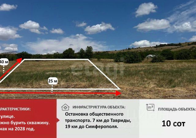 Арт. 90448376. Срочная продажа!!! Участок 10,25 сотки в супер видовом месте в Симферопольском районе, с. Трудовое, СНТ "Меркурий". Коммуникации: Электричество Вода Описание участка: Участок расположен в топовом супер видовом живописном месте. Вид на зеленые поля и гору Чатыр-Даг. Экологически чистый район, тихое место. Соседи только с одной стороны, спланирована дорога и заезд только к себе. Преимущество данной земли: вы будете жить обособленно, своя дорога, вид из окон будет потрясающий!!! Инфраструктура: До остановки общественного транспорта 1,3 км. До Тавриды - 4 км. До центра города - 13 км Рядом крупные развязки дорог, во все уголки Крыма Продажа в связи с переездом! Звоните! Быстро организую показ.