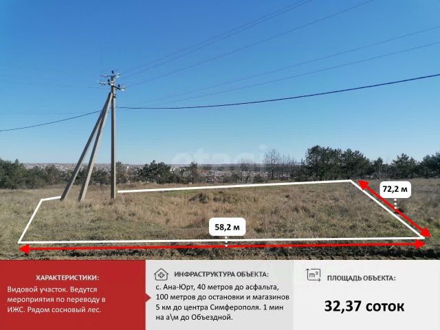 Продаётся земельный участок в Симферопольском р-не ,с. Ана-Юрт, ближайший пригород Симферополя! Это идеальное место для ведения сельского хозяйства на просторной площади в 32,37 соток. Участок ровный, плодородный грунт. В 100 метрах район ИЖС, соседи проводят мероприятия по переводу данных земель в ИЖС. Все коммуникации рядом! Хорошая транспортная развязка, рядом объездная. До центра Симферополя 5 км. Район активно развивается. Наш профессиональный ипотечный брокер готов помочь вам с одобрением на самых выгодных условиях. Стоимость услуг брокера бесплатна. Звоните прямо сейчас в агентство недвижимости "Этажи" — мы гарантируем, что сделаем всё возможное для вашего комфортного и выгодного приобретения. Код объекта: 11966393 МЫ ГАРАНТИРУЕМ ФИНАНСОВУЮ БЕЗОПАСНОСТЬ ДЛЯ НАШИХ КЛИЕНТОВ. Полное юридическое сопровождение сделки. Высокий шанс одобрения ипотеки. Звоните, с удовольствием ответим на ваши вопросы! Код пользователя: 196856 Номер в базе: 11966393